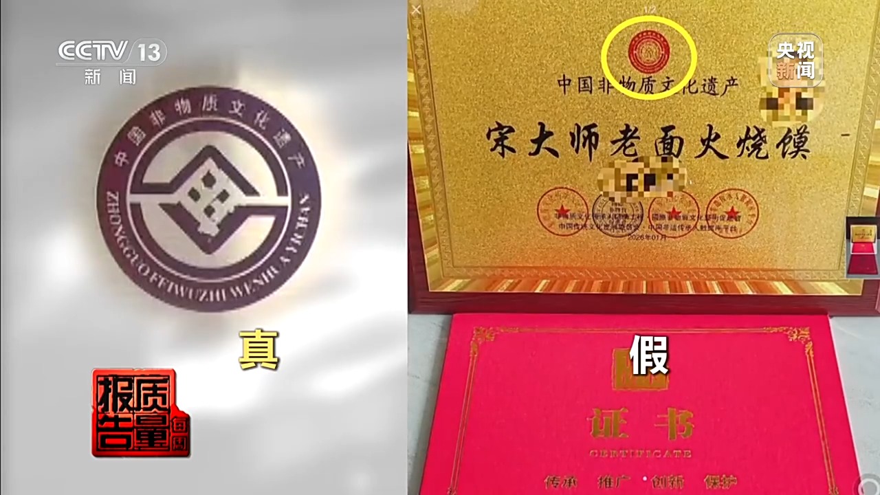 记者同时发现,证书和牌匾上印制的所谓“非遗”标志,与文旅部门公布的中国非物质文化遗产标识,存在明显差异。