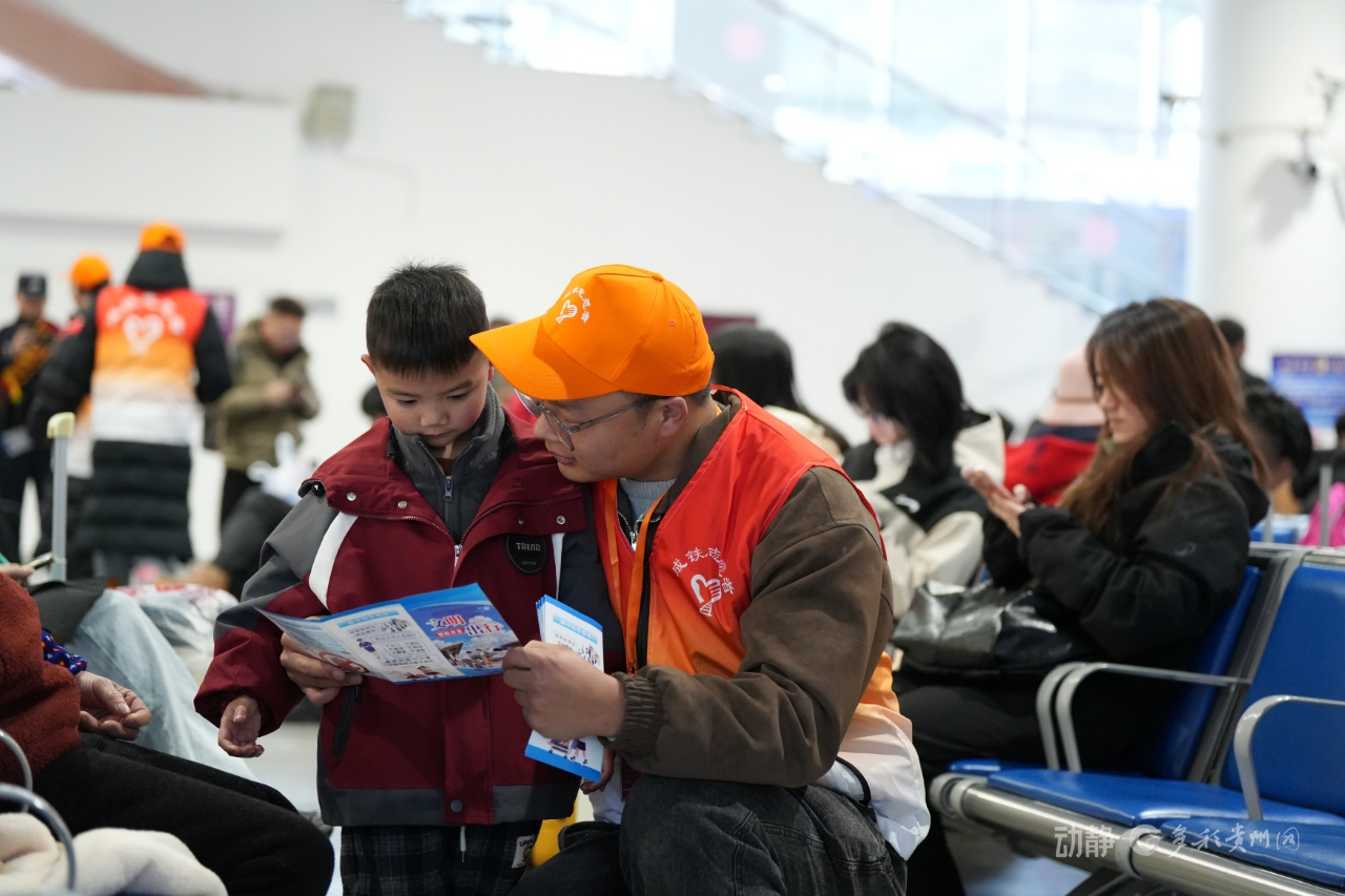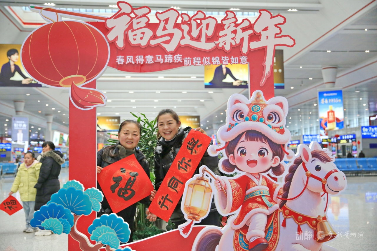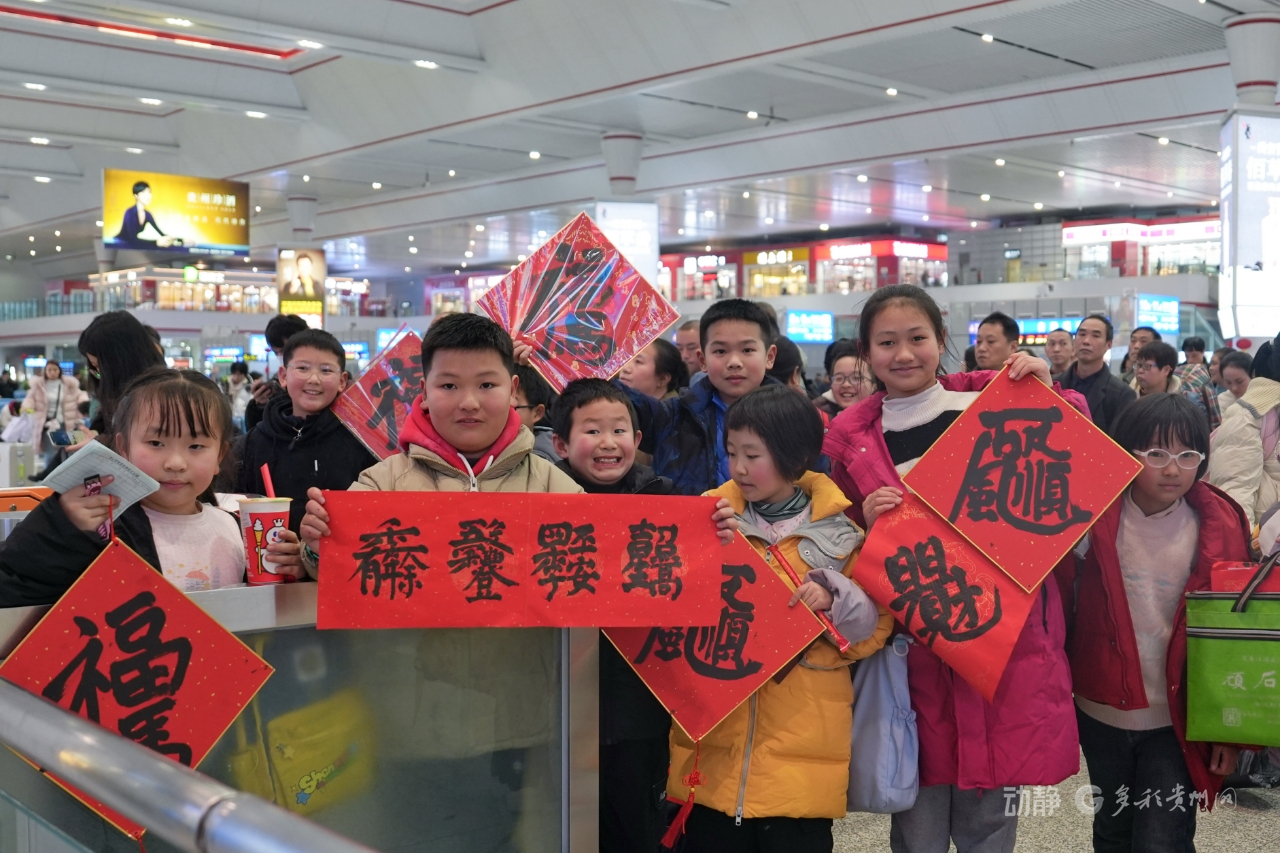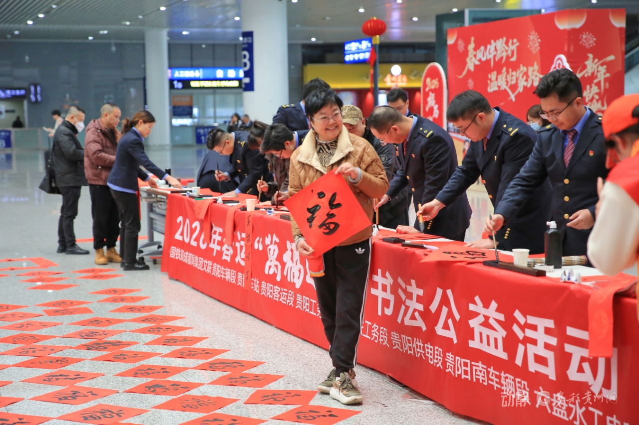 春运首日,铁路部门在贵阳北站开展快闪迎春活动,在部分车间及列车上开展了形式多样的文明宣传活动,设置互动环节吸引旅客抢答,在趣味互动中向旅客普及安全乘车、有序候车、反诈等知识,提升旅客文明出行意识与自我保护能力。在贵阳北站设置“我的铁路风景”打卡点,吸引旅客竞相拍摄打卡。在贵阳北站、龙洞堡站及部分列车上设立返乡服务点,为旅客提供手机免费除尘及贴膜等服务。继续开展“送万福、进万家”活动,由路内外书法家现场书写寓意美好的春联和“福”字,免费赠送给南来北往的旅客。特别是现场根据旅客需求定制书写的春联受到大家广泛好评。