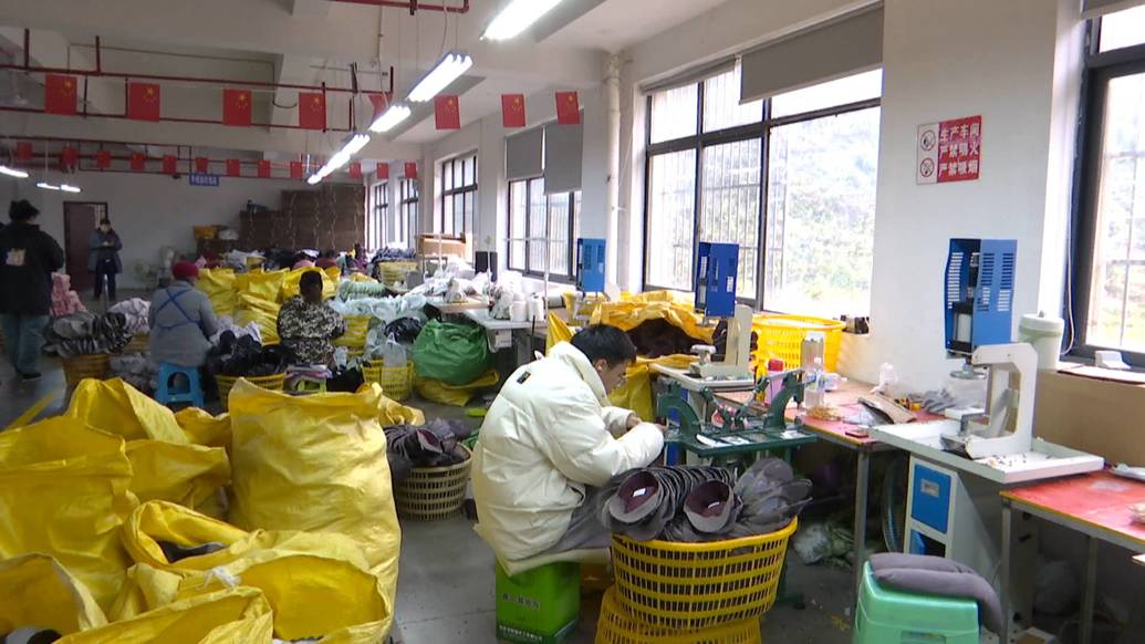 关岭布依族苗族自治县同康社区居民 邓启芬:我们是搬迁来这里,老板来这开鞋厂,社区介绍我来这里上班,上班一个月2000多块钱。在这里做补助家庭,离家近。