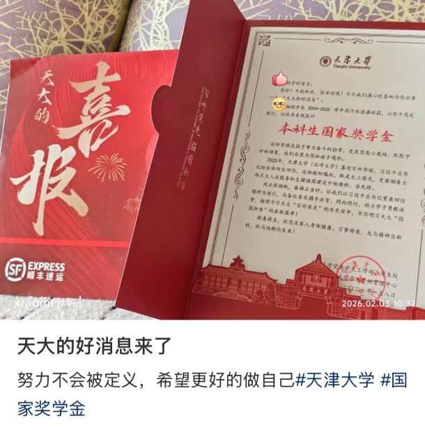 近日,天津大学为获得国家奖学金等各种奖学金的学生定制了荣誉喜报。这一份份承载着荣誉与自豪的红色包裹从天津大学发往全国各地,为1344个家庭送上了一份特殊的“硬核年货”。