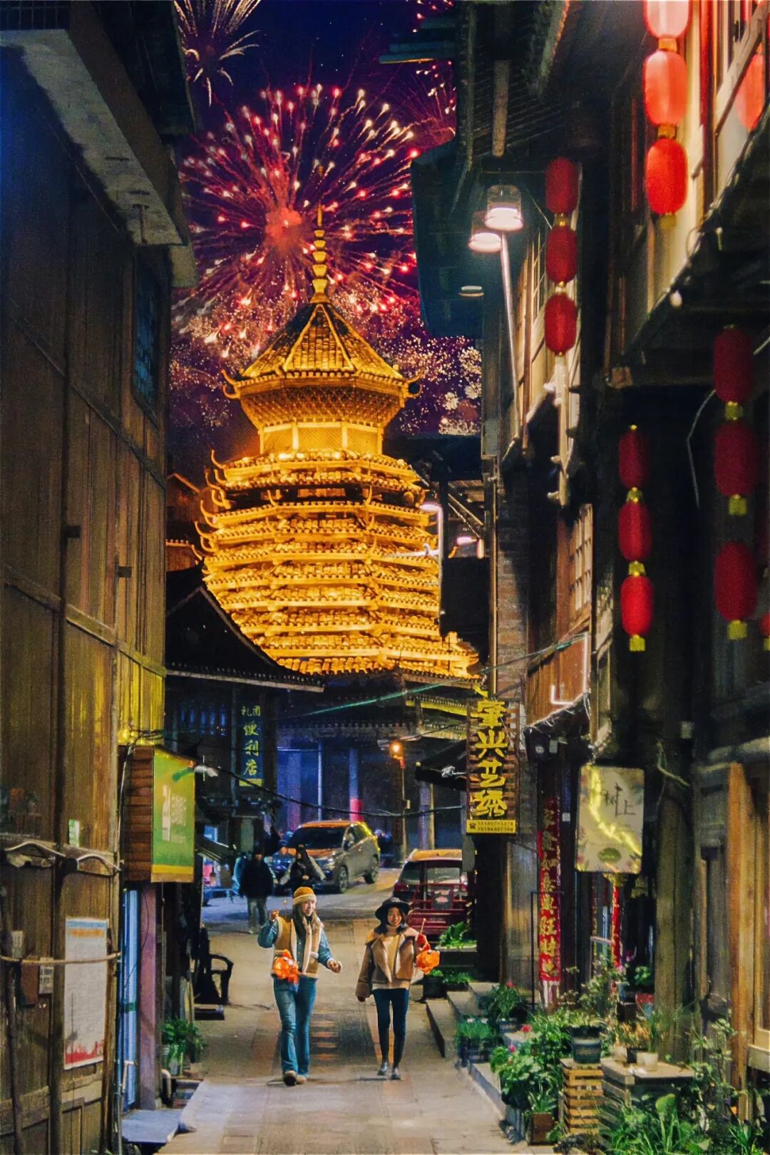 肇兴侗寨的春节,有鼓楼与烟花同框