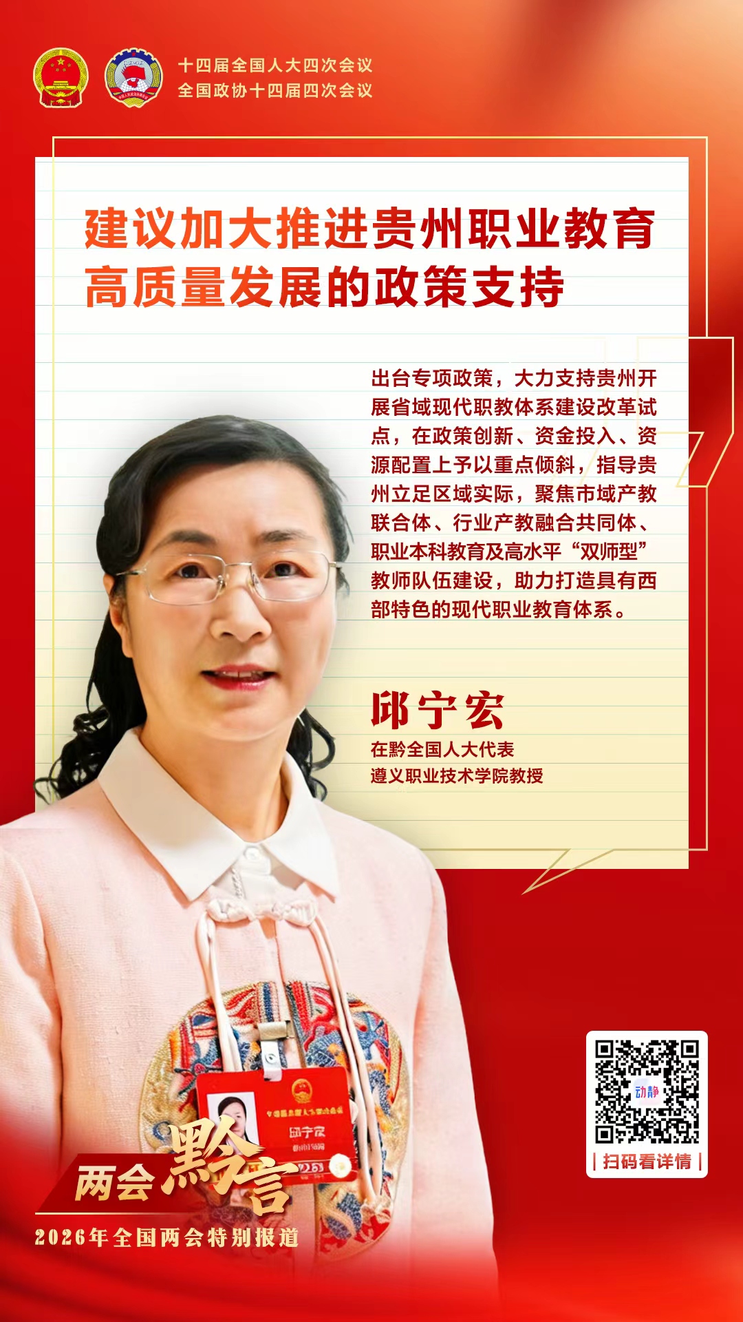 两会黔言丨在黔全国人大代表邱宁宏:建议加大推进贵州职业教育高质量发展的政策支持
