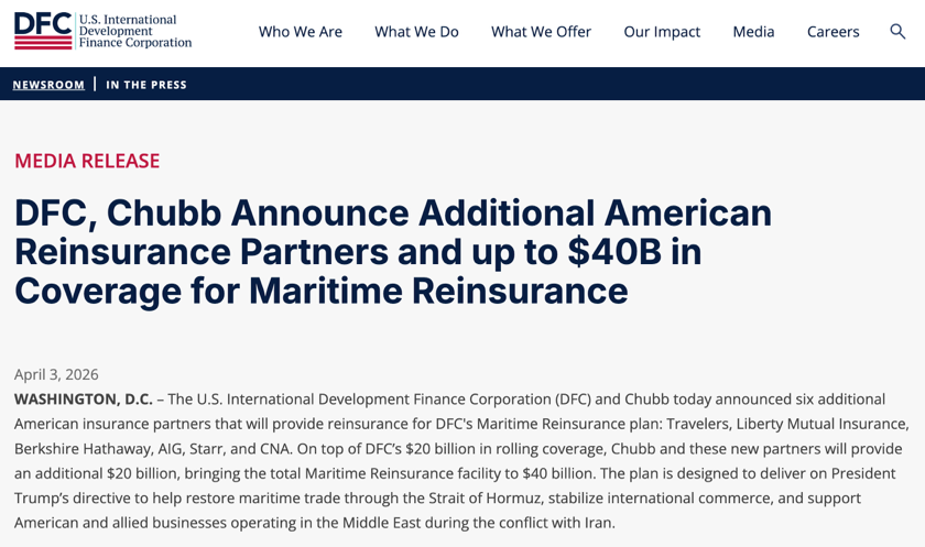 在这套安排中,安达保险扮演的是商业执行者角色。该公司是一家全球大型保险公司,官方介绍称其业务覆盖54个国家和地区,经营财产险、责任险、再保险和寿险等。根据4月3日的官方公告,美国国际开发金融公司与安达保险联合多家美国保险合作方,把霍尔木兹海上再保险的支持扩大到最高400亿美元,覆盖船体、责任、保赔以及货运等风险。更值得注意的是,公告同时承认申请入口和具体流程仍在完善,试图尽快把一套商业工具搭出来,向船东、货主和保险市场发出明确信号:美国愿意为“回到霍尔木兹做生意”承担一部分政治和金融上的保底责任。