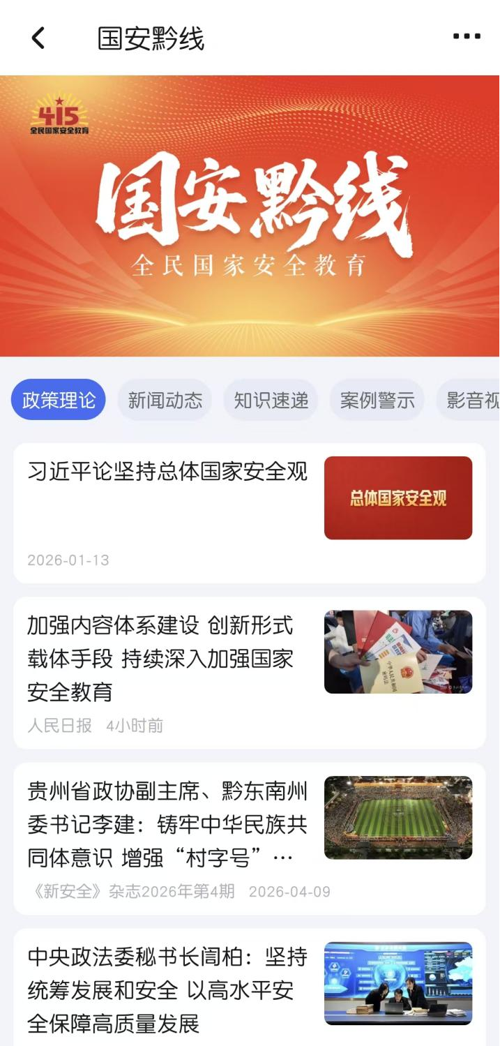 今年4月15日是第十一个全民国家安全教育日,“国安黔线”紧扣“统筹发展和安全,护航‘十五五’新征程”主题,聚焦政策理论、新闻动态、知识速递、案例警示、影音视界等五大板块内容,阐释总体国家安全观,宣传国家安全法律法规,普及国家安全知识,帮助全省干部群众提高国家安全意识和素养,推动大安全理念走深走实。