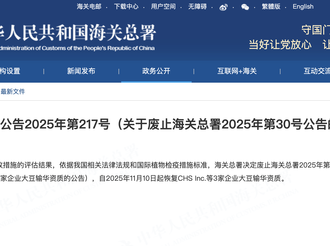 海关总署公告:自2025年11月10日起恢复美国3家企业大豆输华资质2025年11月08日 -